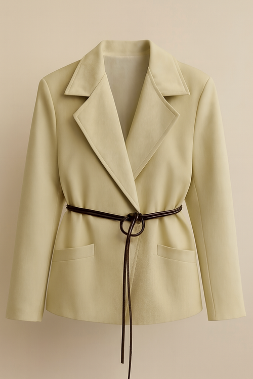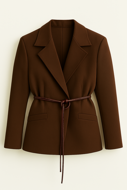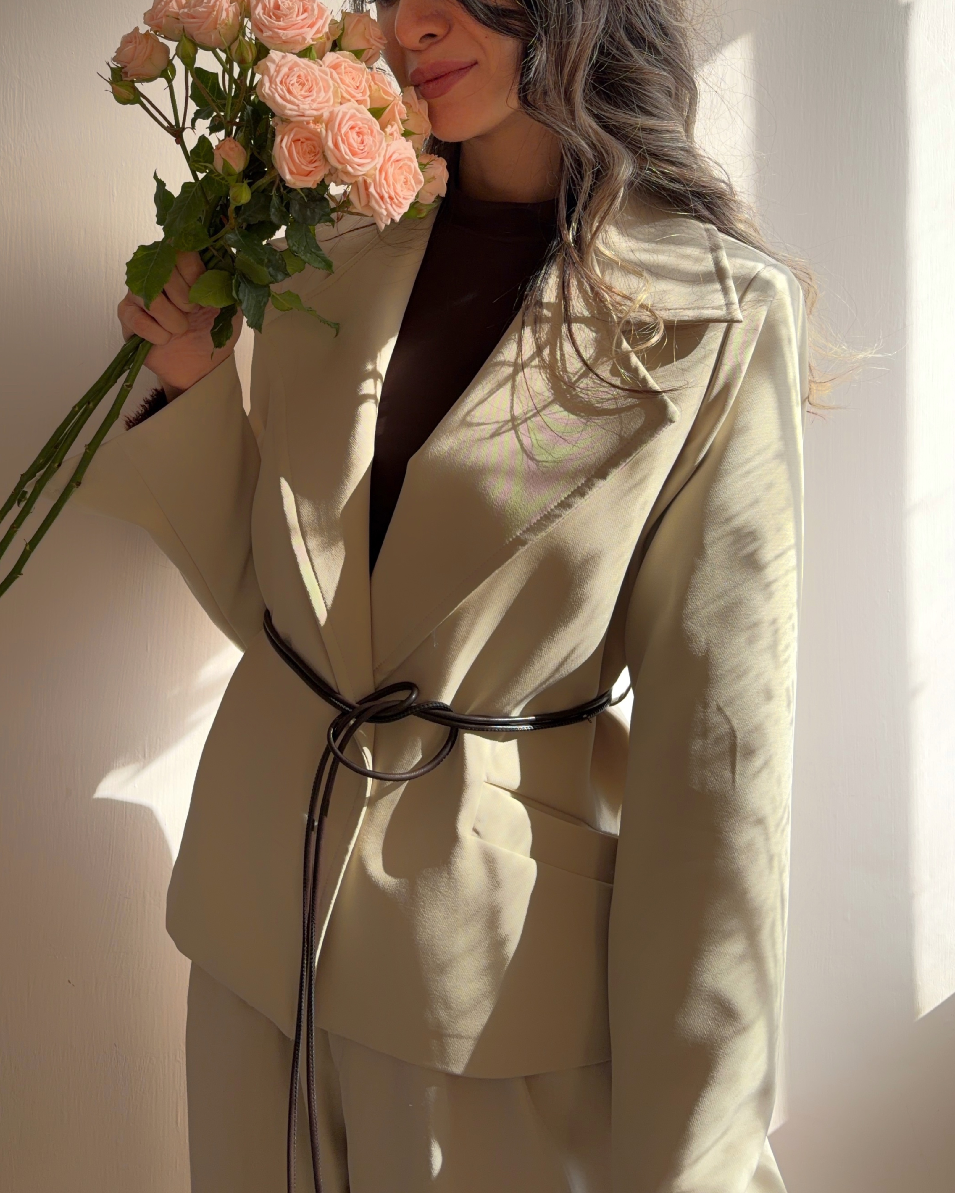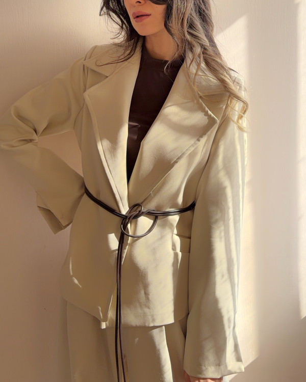 کت کرم و قهوه ای با کمربند چرم قهوه ای