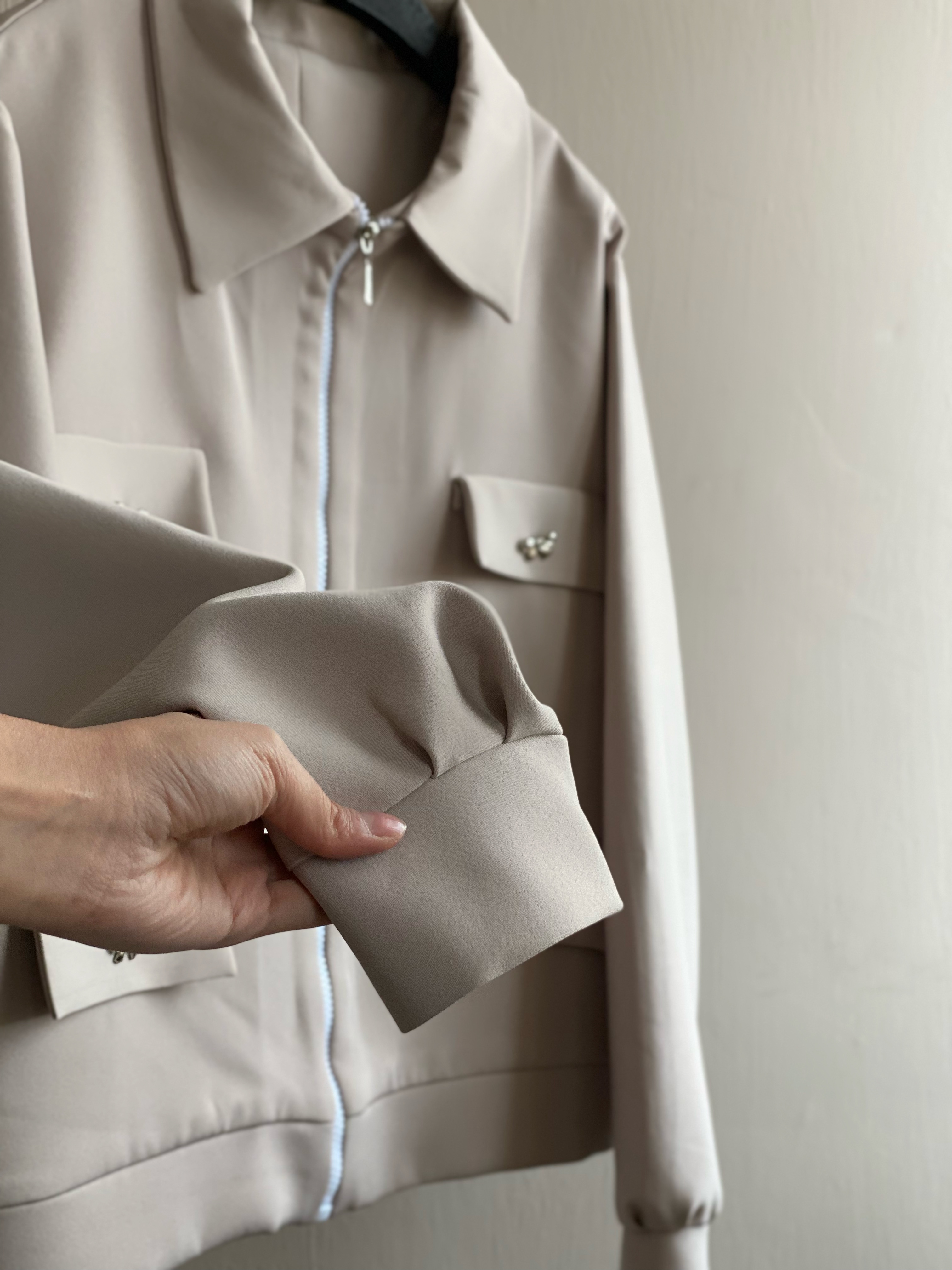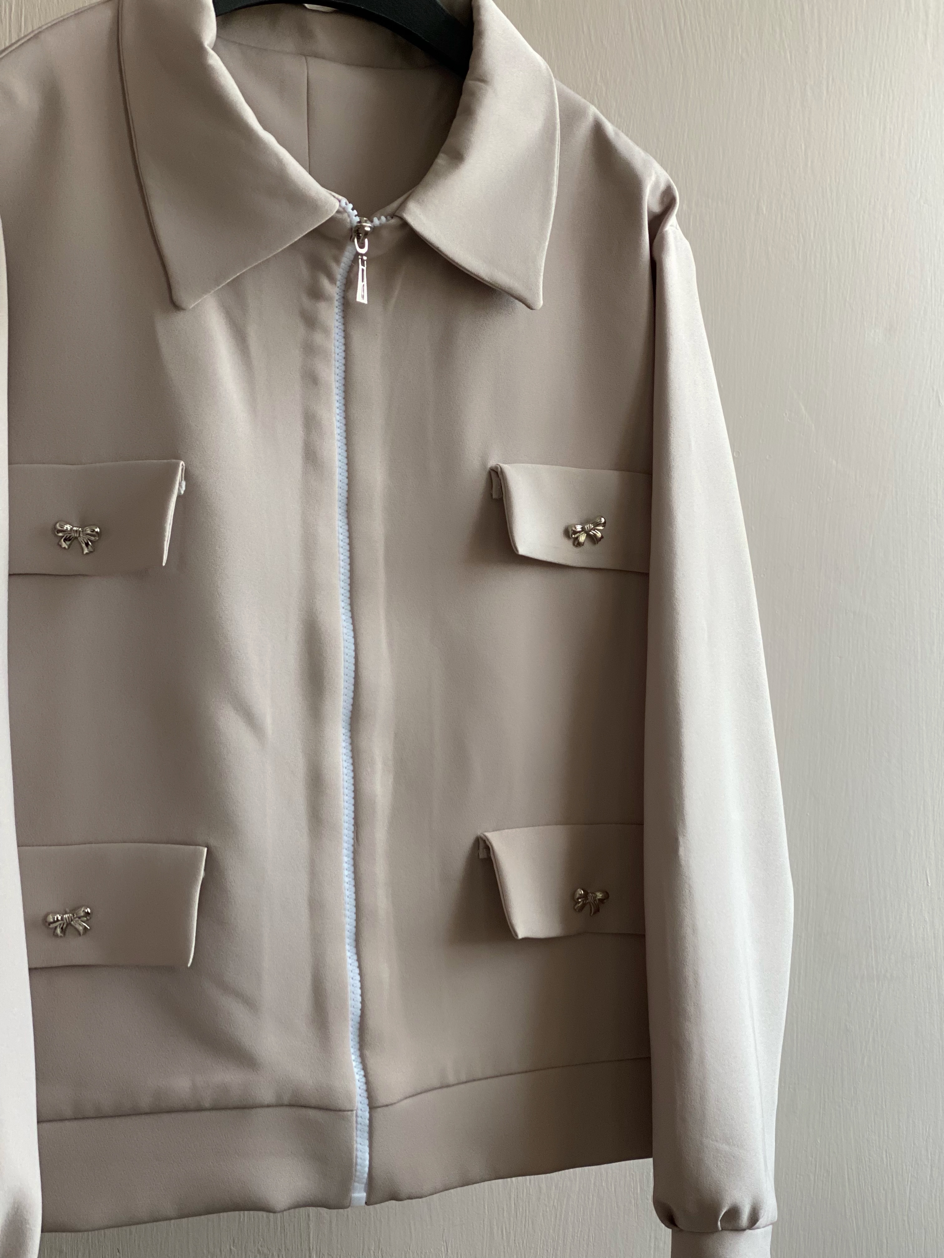بامبر جکت بهاری رنگ یاسی جنس: کرپ غواصی دکمه های طرح پاپیون استیل تمام لایی کوبی شده با دستگاه فیوزینگ مناسب بهار، تابستان و پاییز